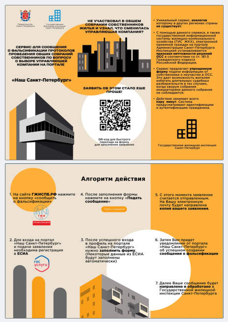 С 16.10.2025 реализована возможность для граждан подать обращение о фактах искажения волеизъявления собственника помещения в многоквартирном доме, содержащегося в решениях и протоколе общего собрания собственников помещений в многоквартирном доме по вопросу выбора, изменения способа управления многоквартирным домом, принятия решения о заключении и (или) расторжении договора управления многоквартирным домом, поданных гражданами посредством электронного сервиса «Сообщение о фальсификации участия в выборе управляющей организации» на портале «Наш Санкт Петербург» в любом подразделении СПб ГКУ «Многофункциональный центр предоставления государственных и муниципальных услуг» (за исключением центров оказания услуг для бизнеса, специализированных и мобильных офисов)